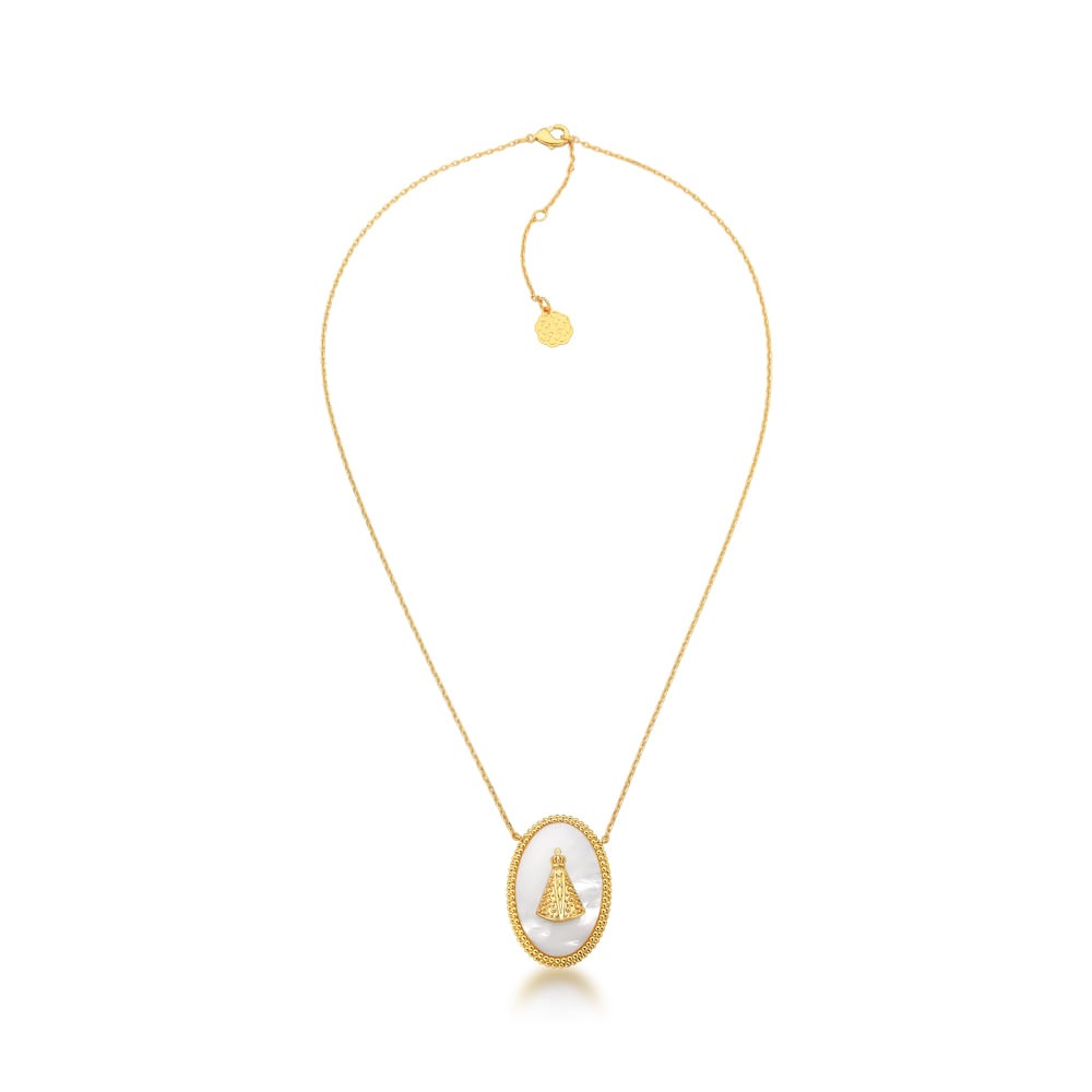 Colar curto com pingente imagem de Nossa Senhora Aparecida em placa oval de madrepérola.