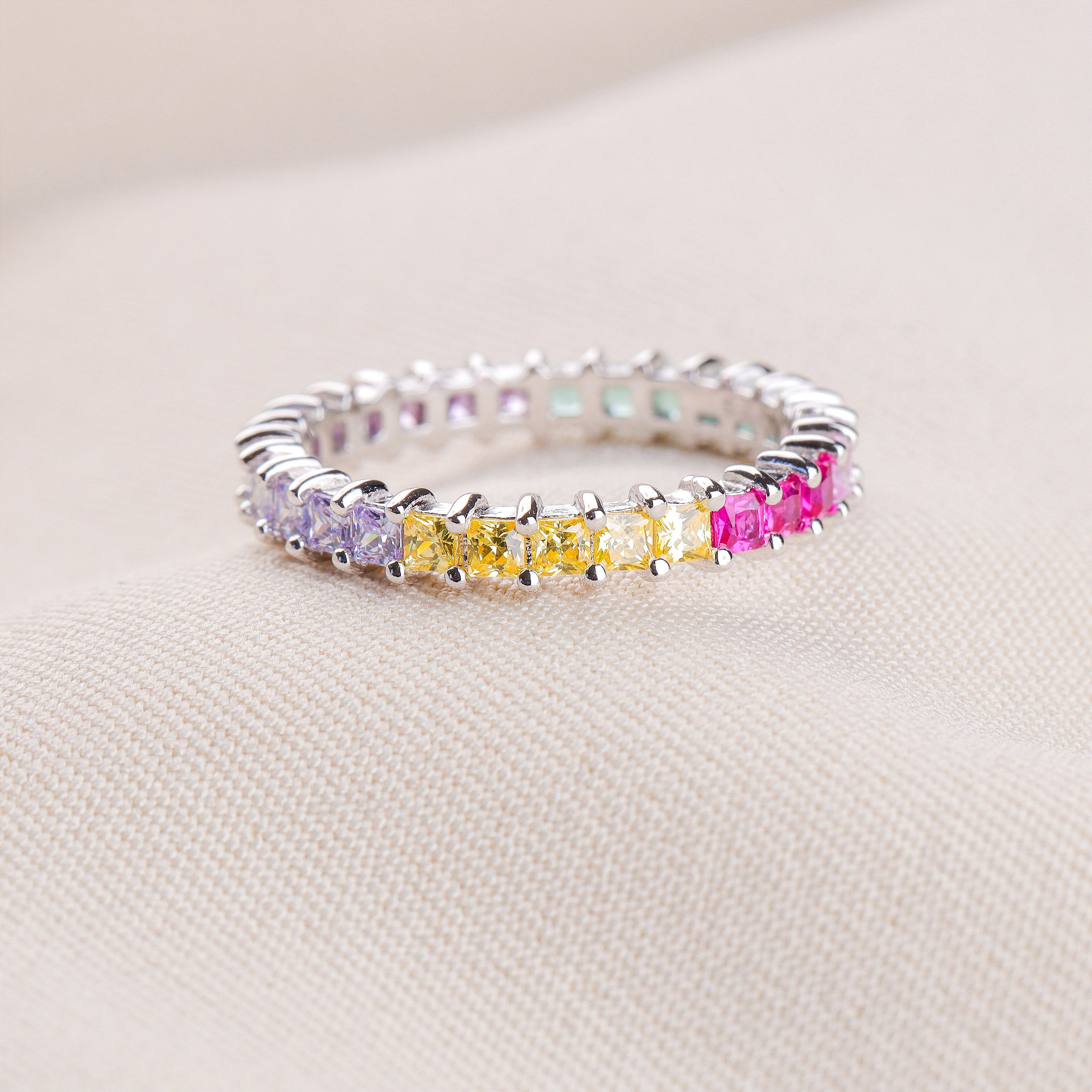 Aliança fina inteira cravejada de zirconias coloridas feita em prata 925 com banho de ródio branco.