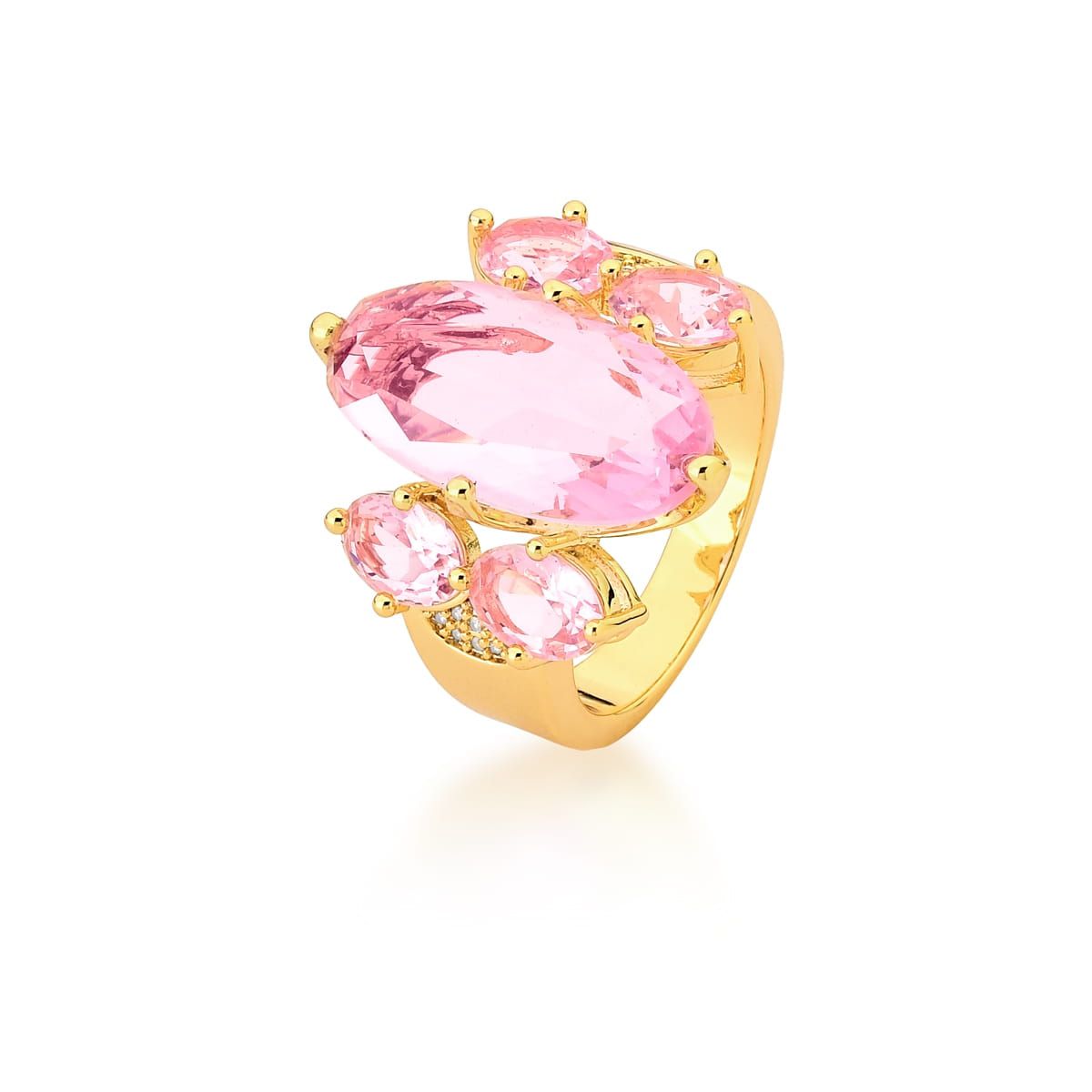 Anel banhado a ouro com cristais ovais na cor rosa e zircônias brancas.