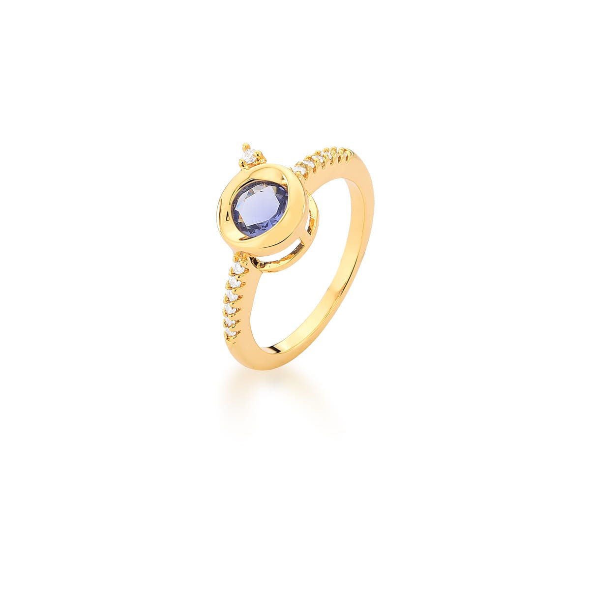 Anel orbital com círculo cristal tanzanita e cravejado de micro zircônias e ponto de luz ambos na branca banhado a ouro.