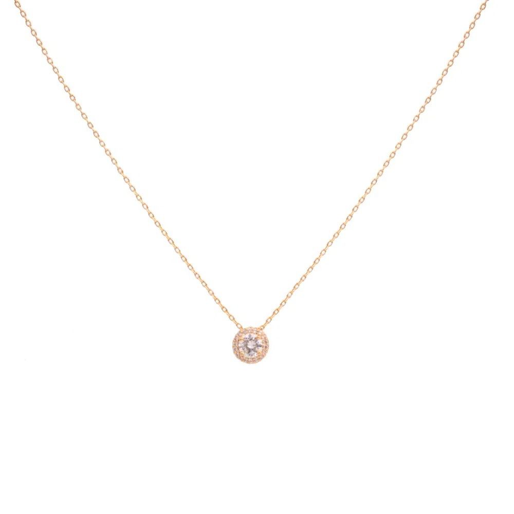 O colar banhado no ouro 18K possui pingente com zircônia branca grande no topo e laterais cravejadas das mesmas pedras, tem 45 cm mas pode ser ajustado para 35 cm ou 40 cm.