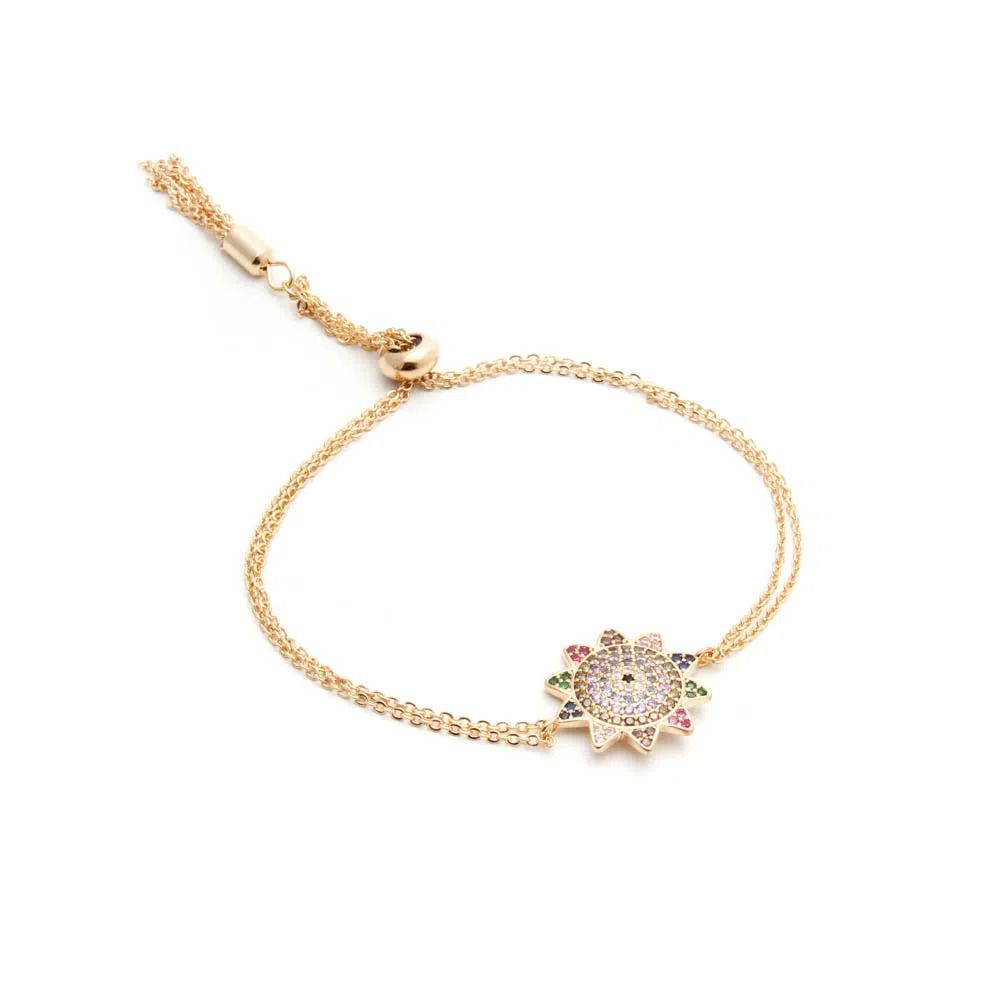 A pulseira folheada a ouro 18K traz olho cravejado de zircônias coloridas e lindo pingente tassel próximo ao fecho. O acessório é regulável e pode ser ajustado ao pulso no tamanho desejado sem causar incômodo.