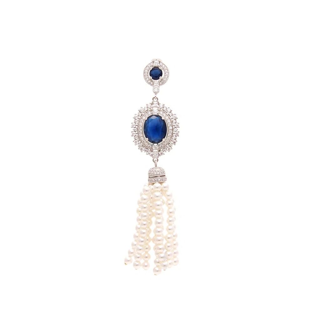 Clássico, o pingente tassel foi elaborado em prata 925 com franja de pérolas, cristais de safira e zircônias brancas cravejadas. Ideal para ser usado em pulseiras e colares.